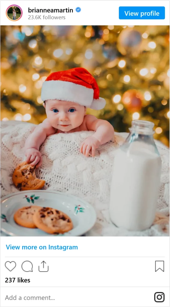 How about incorporating milk and cookies left for Santa? Having your baby sneak one of Santa’s cookies makes for an adorable baby Christmas photoshoot idea.
